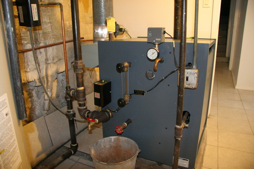 一打開鍋爐間的門馬上一陣熱氣傳出,裡頭還真是頗熱,趕緊把門打開來透透氣.鍋爐間裡面沒啥東西,兩台電熱水器,一台燒瓦斯的暖器.暖器是利用瓦斯燒熱水,然後熱水會透過管線通往房子裡的每個暖氣輸出口.而旁邊牆上是一個溫度控制器用來控制暖氣哪時該運轉,哪時該停.只見控制器好像壞掉似的,運轉燈號亮沒30秒就滅掉了,大概過了10秒後又啟動.難怪暖器有運轉但是沒有暖氣輸出,因為水還沒燒熱就停了啊~