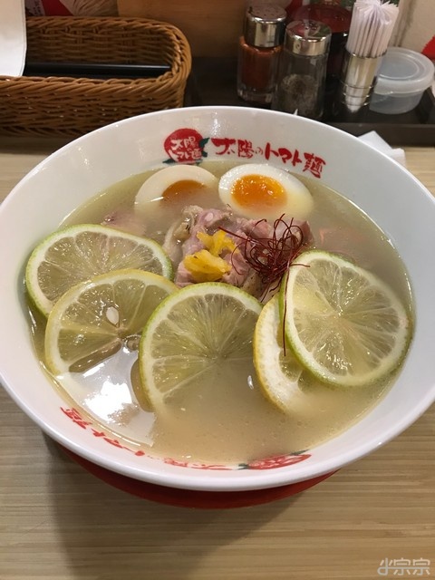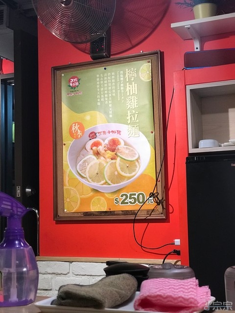 本來想點太陽拉麵的, 結果看到牆上的海報, 就點了檸柚雞拉麵, 有綠的跟黃的兩種檸檬. 上菜時服務生還說有個小彩蛋, 蛋是眼睛, 檸檬是嘴巴. 所以是一個微笑的樣貌呢.