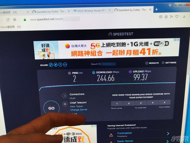 二號機接RJ-45有線透過AiMesh連起來的速度還蠻快的