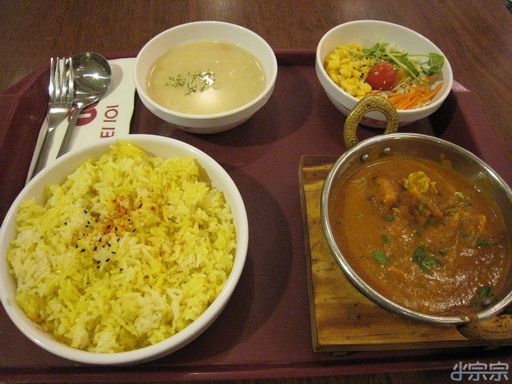 等一下下就來啦~飯是用一般美國中國餐館那種難吃的長米,湯是西式的玉米濃湯,沙拉是和風的,這些味道都一般,重點是那一小盅咖哩,嗯~味道還不賴,很印度的感覺,而且中辣的等級真的是中辣,吃一下就會有額頭滲出一絲絲汗水的辣度,不過和麻辣鍋比辣度還是很低的.整體感覺那盅咖哩確實很不賴,不過其他就一般而已囉,價位是NT$180,略貴一些.