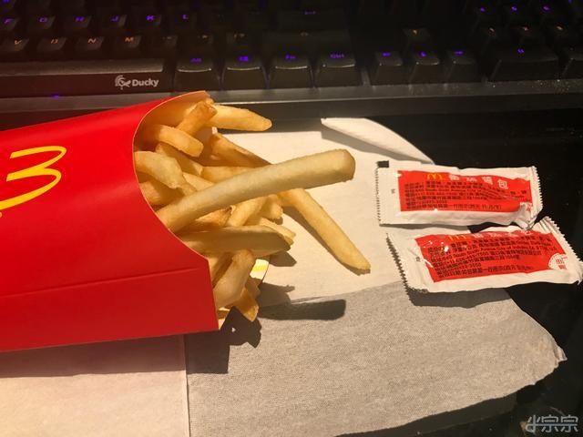新北餐廳最近又不能內用了, 所以外帶了麥當勞, 一定是店員看小宗宗比較可愛所以多給了一包番茄醬~
