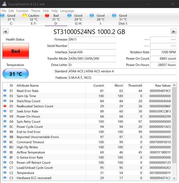 舊的這顆ST31000524NS是Seagate 1TB企業級硬碟. 是2011-01-07開始服役的, 至今11年多, 通電時間一共28057小時. 因為SMART回報ID 05發生異常(壞軌數增加), 雖然說其實沒有繼續擴大其實繼續用也沒什麼問題. 不過十一年也差不多該汰換了.