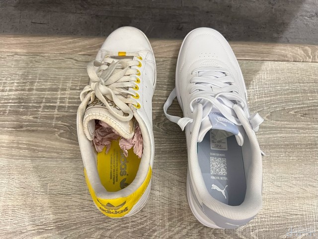左邊的黃色愛迪達是2011年買的, 那時候為了要出鏡音才買了那雙鞋子, 不過那雙幾乎只有cos鏡音才會穿, 前陣子去桃園cos鏡音放歌都還有穿去, 不過很多地方都脫皮了也是該換了.