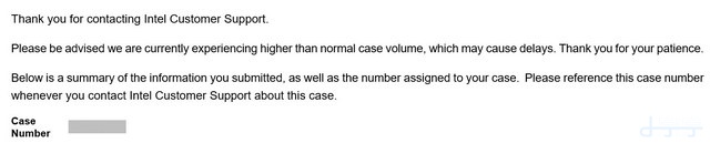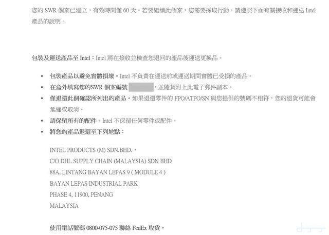整個流程從送出RMA申請到收到CPU大約10天(含假日), 遇假日基本上馬來西亞哪邊不會投遞. 所以趕時間盡量避開假日. 基本上除了時間成本與快遞單的列印外其他費用都由Intel買單.