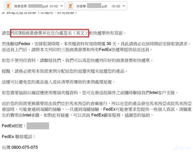 電話客服可能會要你填寫出口個人委任書, 不過收貨小哥和小宗宗說這是Intel寄的, 所以不用附沒關係.